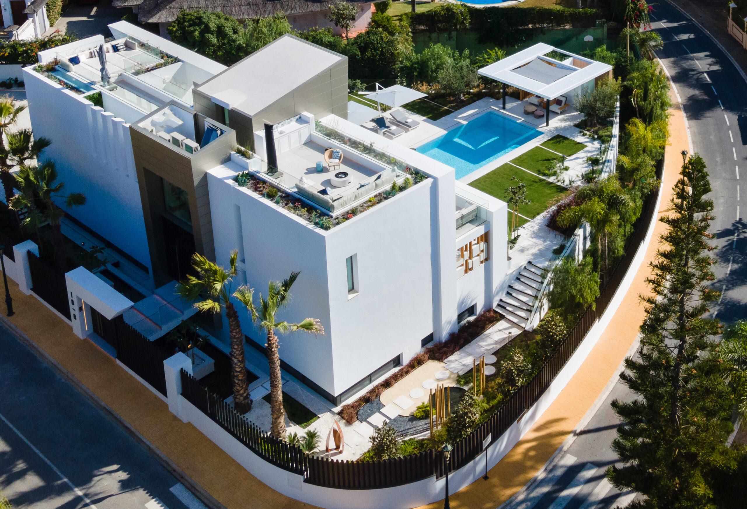 Este jardín surge a partir de un lienzo en blanco, en donde la geometría define cada una de las zonas que lo componen. Líneas rectas y curvas marcan el ritmo con el que disfrutar del jardín, que envuelve y unifica el espacio de la villa.