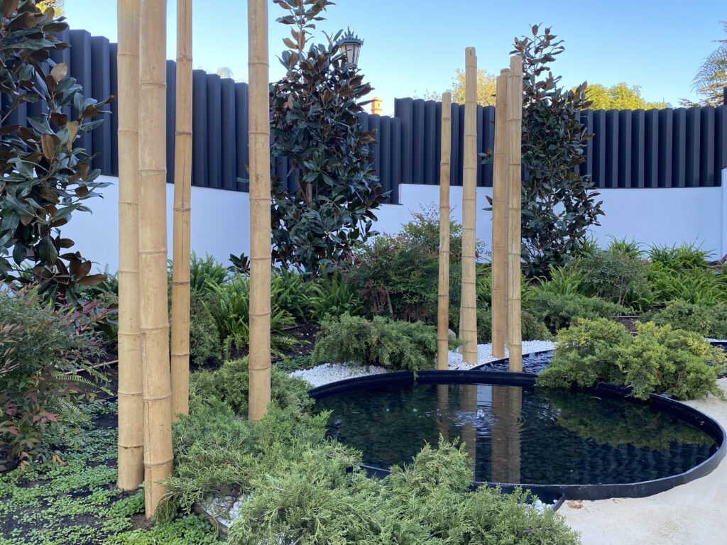 Las plantas utilizadas, ( como las gramíneas, helechos, juníperos, buxus, Sansevieras, papyrus), dan movimiento y estructuran las comunicaciones entre las diferentes zonas del jardín.