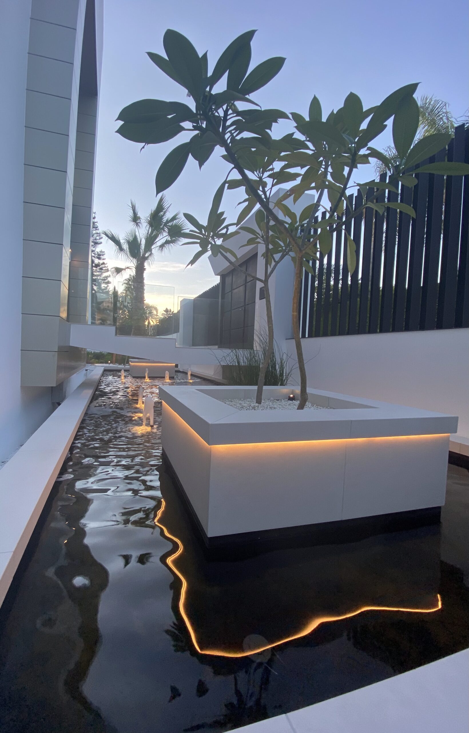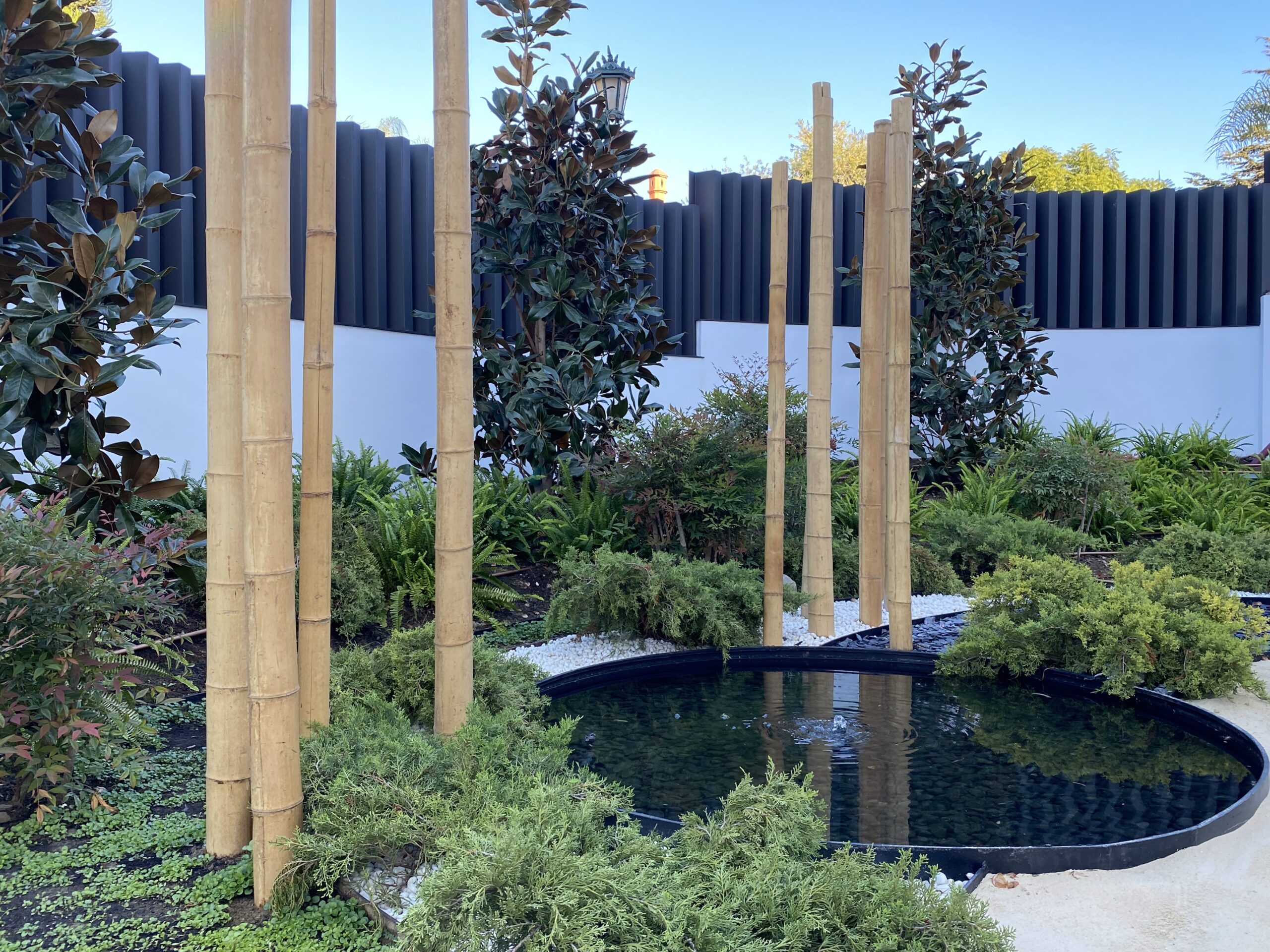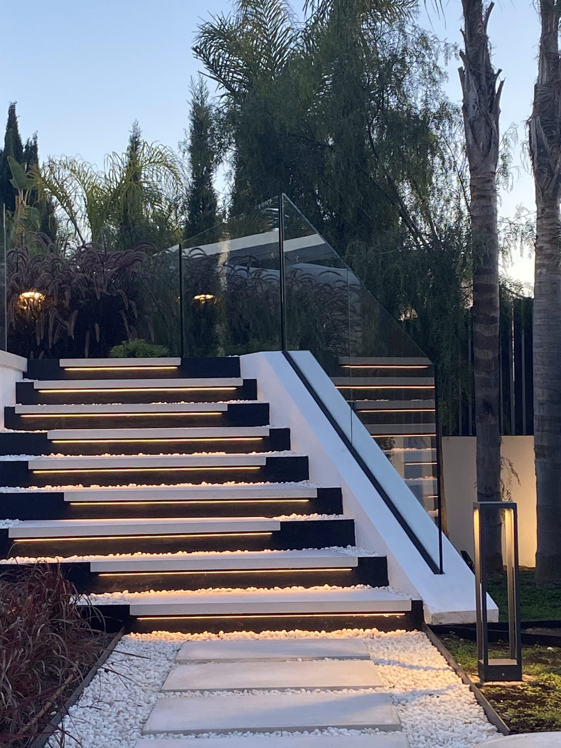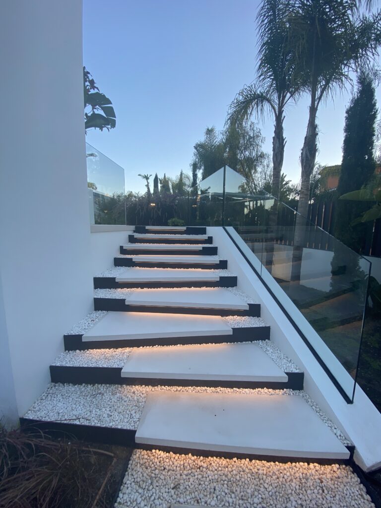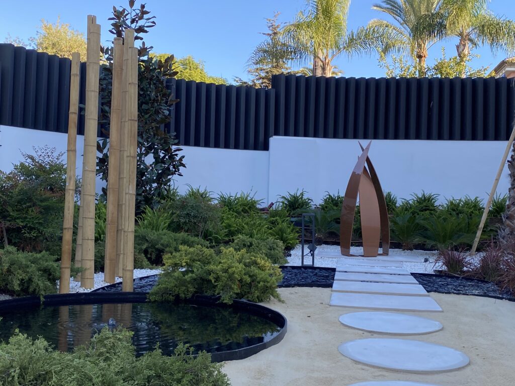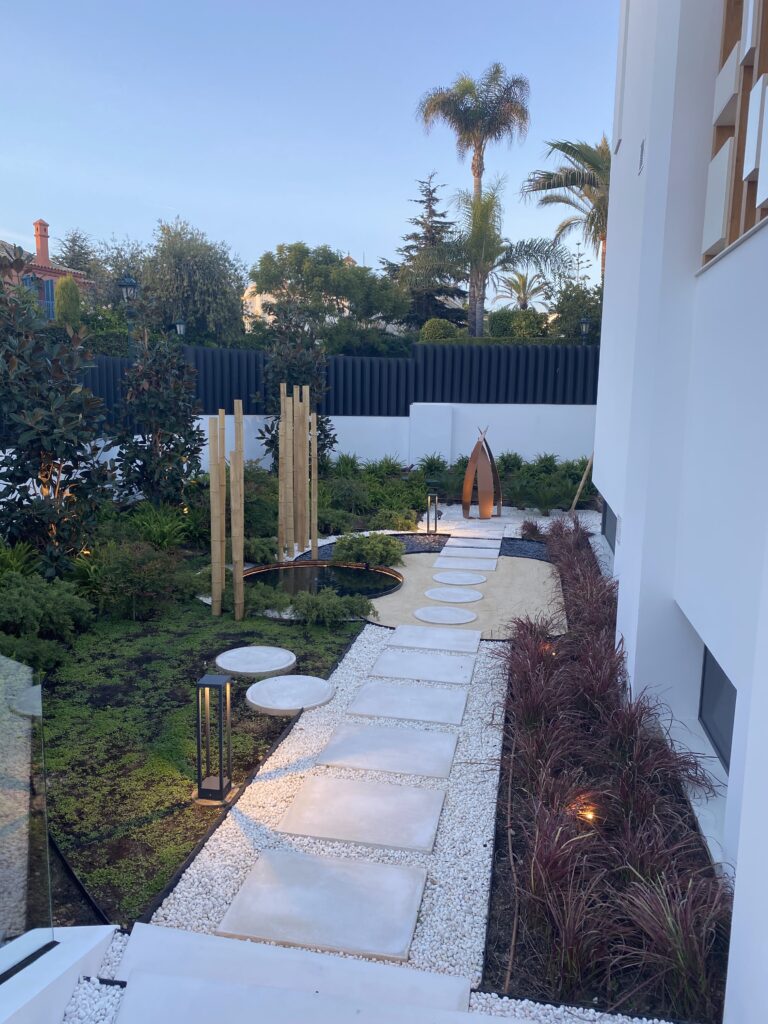 Diferentes elementos incluidos en el jardín como arenas, gravas ornamentales color blanco, pasos de hormigón blanco, escultura, escaleras diseñadas especialmente para salvar desniveles en el jardín, configuran el punto de unión entre las diferentes zonas que lo conforman, consiguiendo un conjunto tranquilo y armonioso.